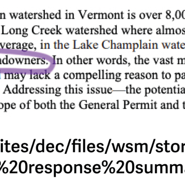 “As it stands, the 3 acre sites are looking at significant costs and the projects of less than 3 acres are not,” said Monk. “So there’s a fairness question: does it make sense to have this relatively limited subset of property owners incur these costs where most landowners would not incur any costs?… What’s the solution? It’s kind of infeasible to make everybody get a permit.” - VT Digger "Ambitious new stormwater permit prompts cost concerns", by Elizabeth Gribkoff November 8, 2019
